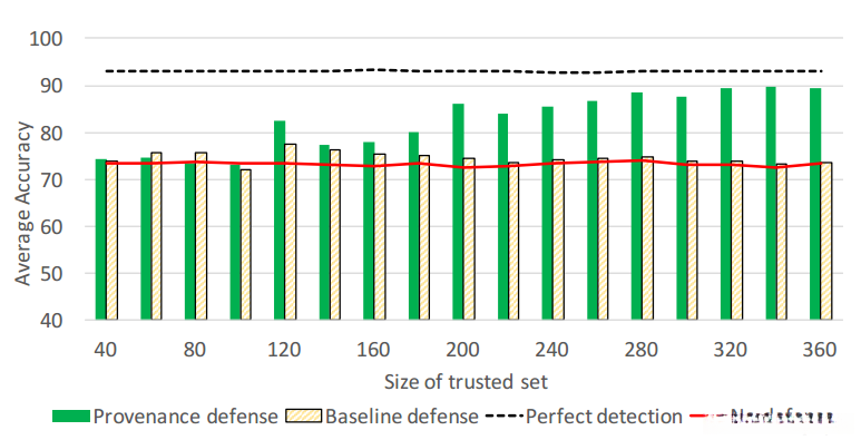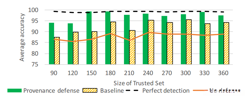 评估毒性的效果可通过衡量完美检测边界与无防护边界之间的距离来体现;如果放弃部署毒性检测机制,攻击者平均会使得系统的准确率下降约20%;通过对各防御策略进行比较,我们得出了它们在不同信任集规模下的准确度分布;实验数据显示,针对类型I的毒性攻击,至少需要120个可信赖的数据样本才能使溯源机制的效果超越未采取防护措施的情况;当可信赖的数据样本数量达到280个时系统趋于稳定,最终准确率达到近乎完美水平;相比之下,基线防护机制在这种类型下的探测能力表现欠佳,即使是在更大的信任集中也未能显著改善情况;这些实验结果凸显出信任集规模对毒性探测性能的重要性,并表明增加可信赖数据样本的数量能够显著提升防护机制的有效性