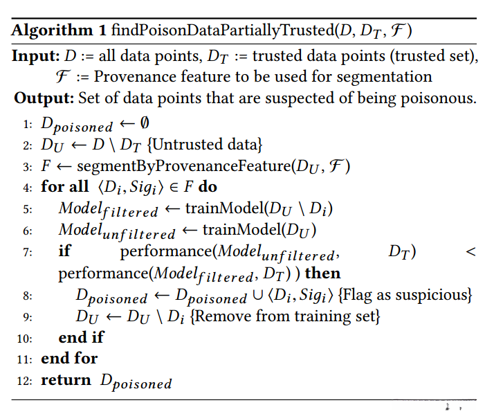 该算法的主要理念在于:类似于基于部分可信赖数据源的防御机制,在这种情况下,该方法通过对比包含特定数据与不包含特定数据时模型的行为特征,从而识别出潜在的危害