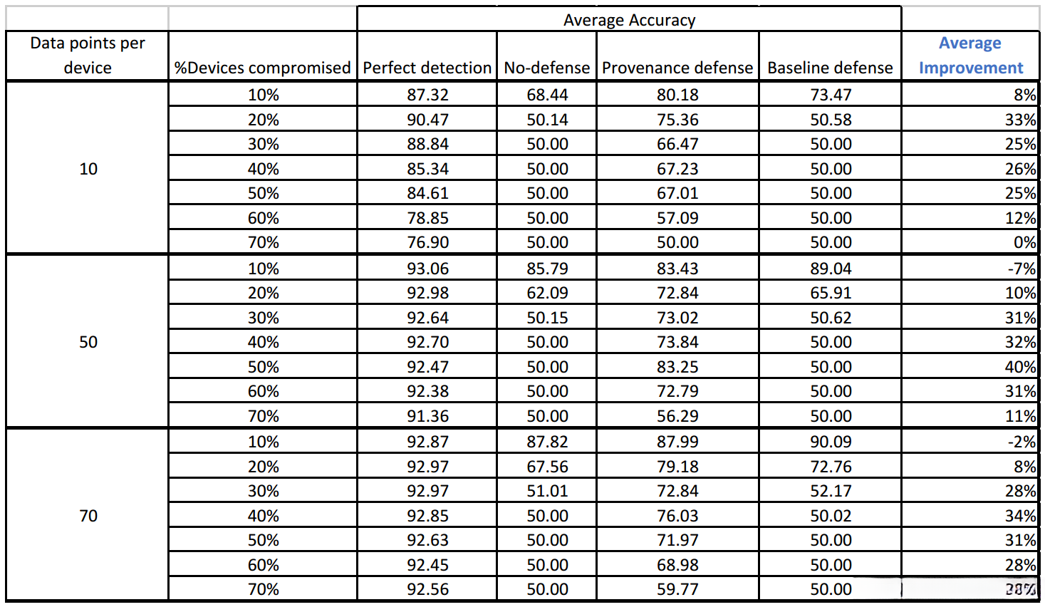 该研究者在前一阶段的实验基础上进行了重复试验,并对每个参与设备的数据贡献量进行了重新设定。具体结果则通过附图进行了直观展示。详细列出了完美检测的成功率、无防护方案的准确率以及采用防御措施时的两种评估方法的平均准确率。其中最后一列数据对比显示,溯源防御机制相较于基准方案在性能上有所提升。值得注意的是,在面对更多被破坏设备的情况下,该防御机制的效果逐渐减弱;同时,在不同数据点贡献水平下进行评估时发现,在相同数量的数据点贡献下(即每台设备提供相同量的数据),该防御机制相较于基准方案在性能上有所提升。