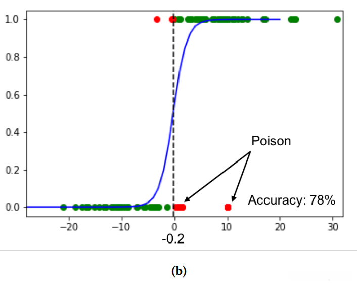 图a展示了在完整数据集上训练所得逻辑回归模型的表现;对比之下,在移除非毒性的样本后重新训练得到的新模型如图b所示。通过观察图表中的变化可以看出;决策边界的位置发生了显著的变化;它现在位于-0.20处;这比之前的2.84位置要低得多;并且这种变化趋势表明决策边界已趋近于真实的边界值为零的情况。值得注意的是;在验证集样本中x=1处原本应为非毒性的样本现在被判定为有毒;这种误判现象的发生直接导致准确率从原先的82%降至78%;这一现象表明;在去除非毒样本的过程中模型准确率从原先的82%降至78%;这进一步证明;在当前的数据集中非毒性的样本并未被成功识别出来