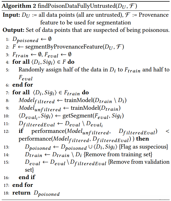 在某些情况下, 获取少量可靠的数据集十分困难. 因此, 作者提出了一种基于溯源的毒性检测机制, 并且即使所有收集到用于重新训练的数据均为不可靠的来源, 该机制仍能正常运行. 为了使该方法适用于全部不可信的数据源, 作者提出以下步骤: 第一步是数据预处理; 第二步是特征提取; 第三步是模型训练; 第四步是结果验证.