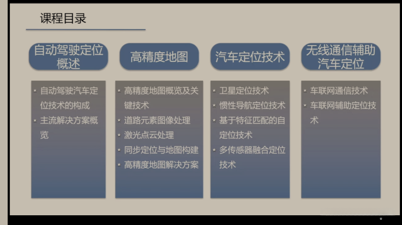 本课程全面阐述了自动驾驶汽车定位技术的相关内容。围绕实现自动驾驶汽车定位的需求展开讲解,详细阐述了实现这一目标所涉及的高精度地图构建、多传感器融合定位技术和辅助性感知手段等三大核心模块的基本原理及其最新发展成果,并通过一系列实践案例进行了验证