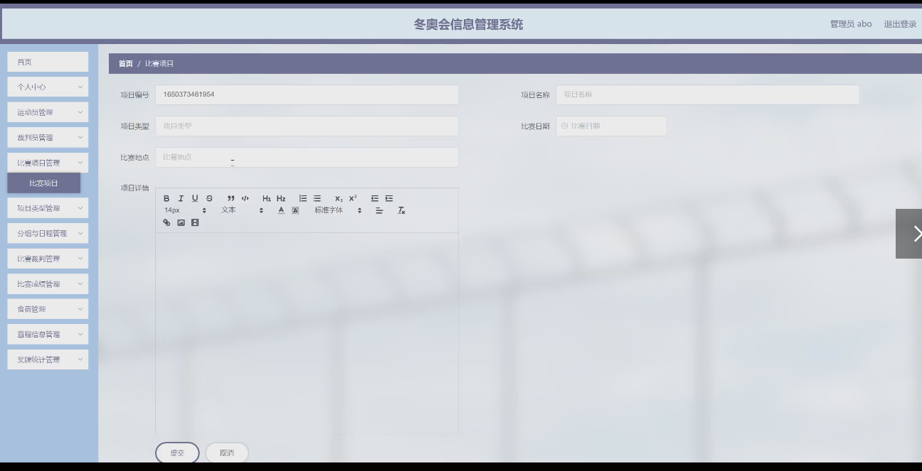 本次毕业设计主要是在利用Java语言平台进行设计与开发一个冬奥会信息管理系统软件。目前由Google提供的Springboot框架将被采用以实现对比赛项目查询功能模块以及比赛成绩查询功能的具体实现。值得注意的是虽然传统数据库(如MySQL)在灵活性方面稍逊于面向对象的技术但在Springboot框架的应用上仍然展现出较高的灵活性与便利性。系统的主要功能包括以下几个方面: