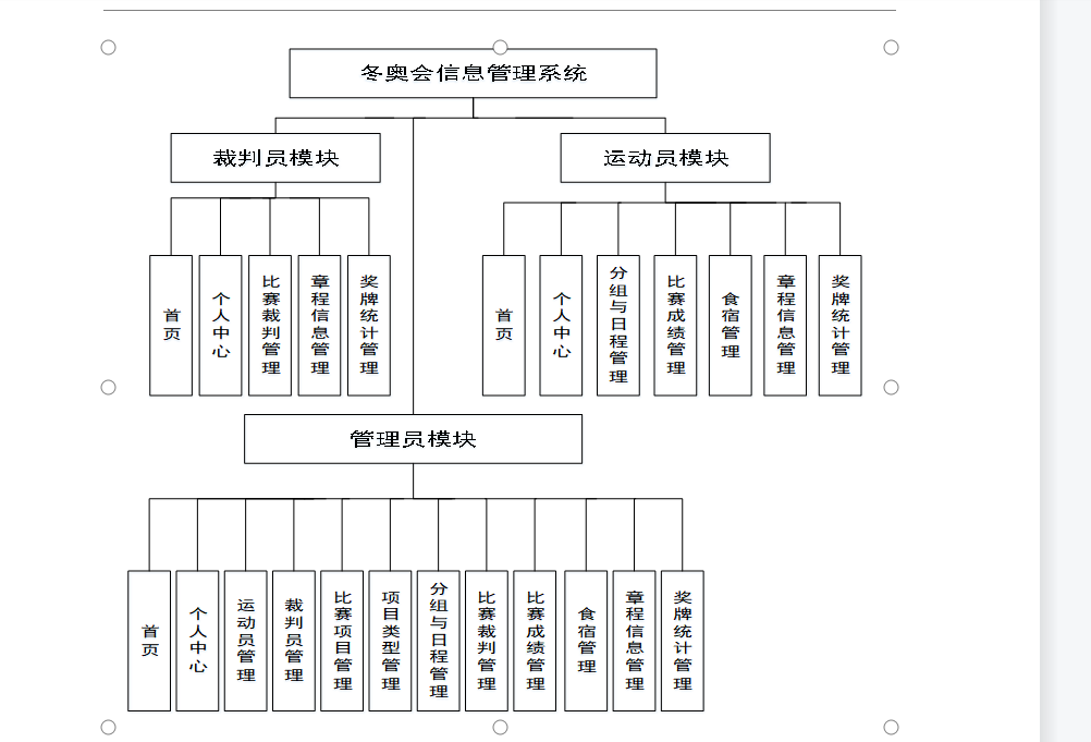 本冬奥会信息管理系统主要包含有三大功能模块:裁判员功能模块、管理员功能模块以及运动员功能模块。