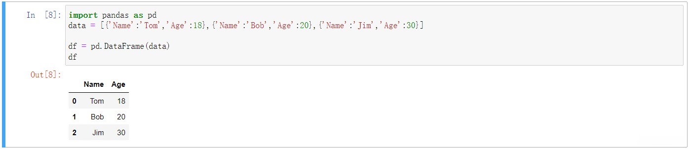 data = [{'Name':'Tom','Age':18},{'Name':'Bob','Age':20},{'Name':'Jim','Age':30}]