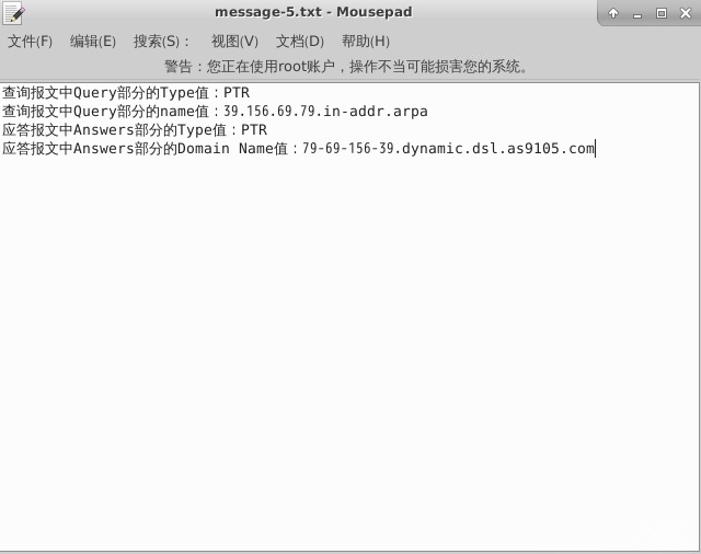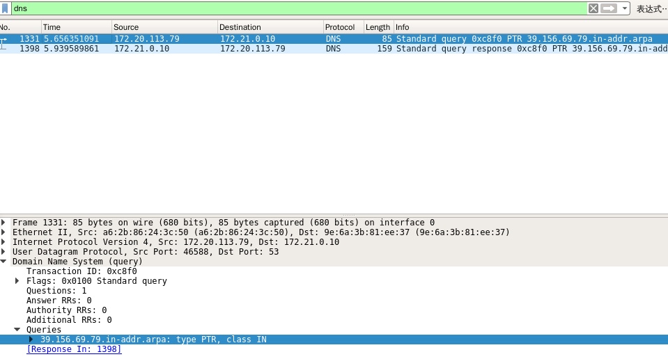 在Query字段中观察到:此报文的Type字段值为PTR(ReverseTranslationRecord),即实现反向解析过程。其中name字段包含IP地址并附加了in-addr.arpa的部分。