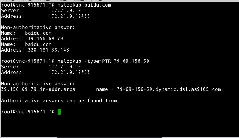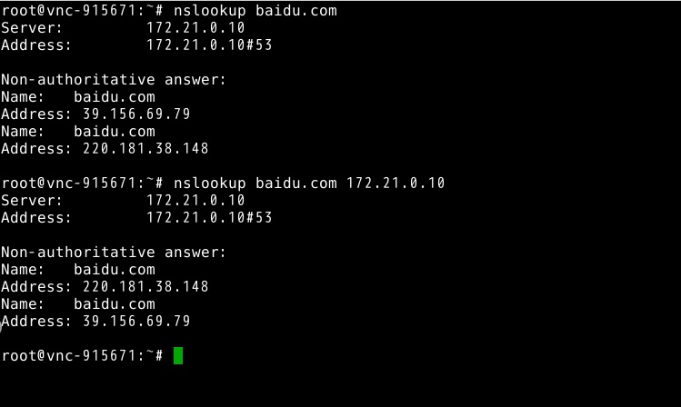 从中可以看出: (1)baidu.com 的域名解析所使用的 DNS 服务器地址为 172.21.0.10; (2)baidu.com 域名对应的主机拥有多少个 IP 地址。