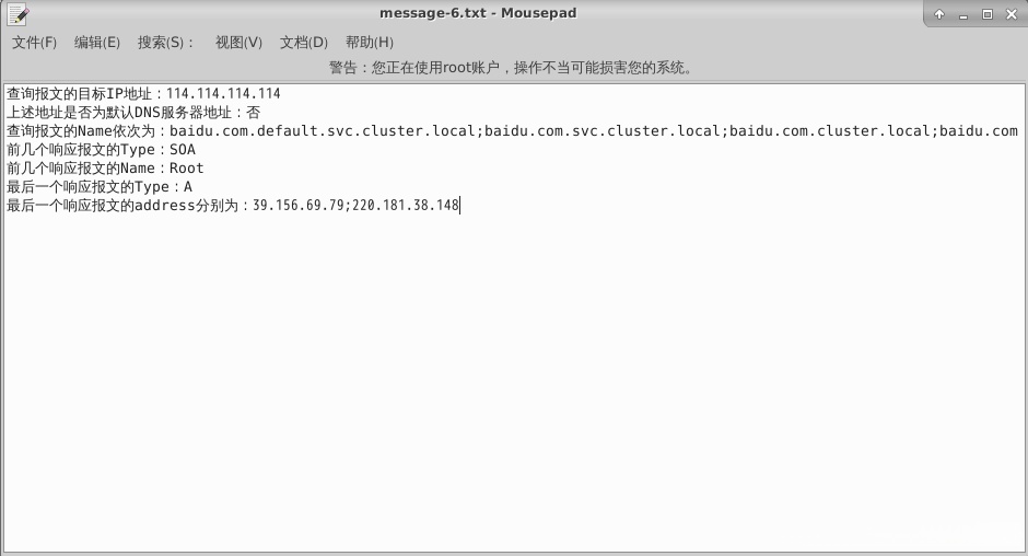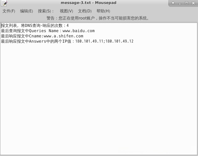 (1)打开 Wireshark ,并在过滤器中输入 DNS 。筛选出 DNS 协议报文,并开始捕获报文。然后打开终端,输入命令并执行nslookup www.baidu.com,在 Wireshark 中停止捕获报文; (2)查看报文列表,将 DNS 查询-响应的次数写入文件中; (3)展开最后一轮查询报文,分析协议字段中各字段的值,将 Queries Name 的值写入文件中; (4)展开最后一轮响应报文,分析协议字段中各字段的值,将 Answers Cname 的值写入文件中; (5)展开最后一轮响应报文,将 Answers 中的两个 IP 值写入文件中(两个 IP 地址用”;”隔开); (6)保存文件并使用 git 将文件 message-3.txt 推送到远程仓库,此步骤不影响评测。