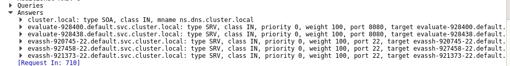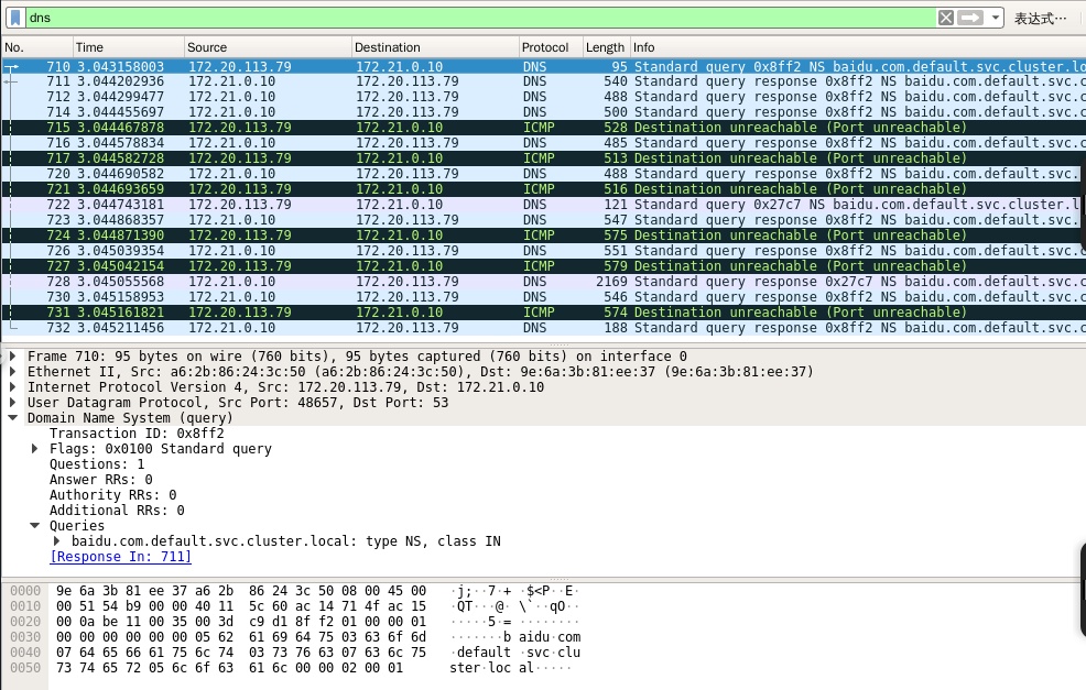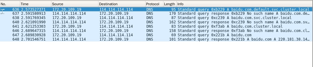 观察报文列表可知,在经历多轮查询与回应后,在第N轮终于获得了baidu.com的A类地址。依次查看各次查询对应的百度域名如下:baidu.com.default.svc.cluster.local、baidu.com.svc.cluster.local、baidu.com.cluster.local及baidu.com
