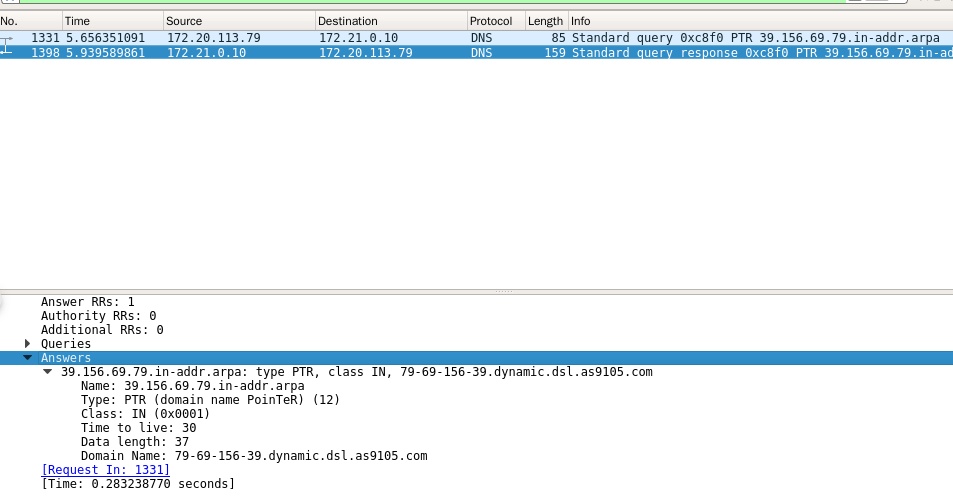 详细查看该报文的答案部分时会发现以下信息:其中查询类型为 PTR;查询名称由 IP 地址加上 in-addr.arpa 子域组成;而响应返回的有效域名称为 79-69-156-39.dynamicdsl.as9105.com。