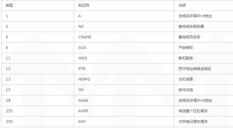 查询其他记录,语法格式如下: nslookup -type=type domain