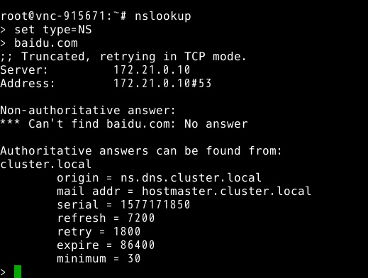 可以看出,其权威 DNS 服务器的名称为:ns.dns.cluster.local。