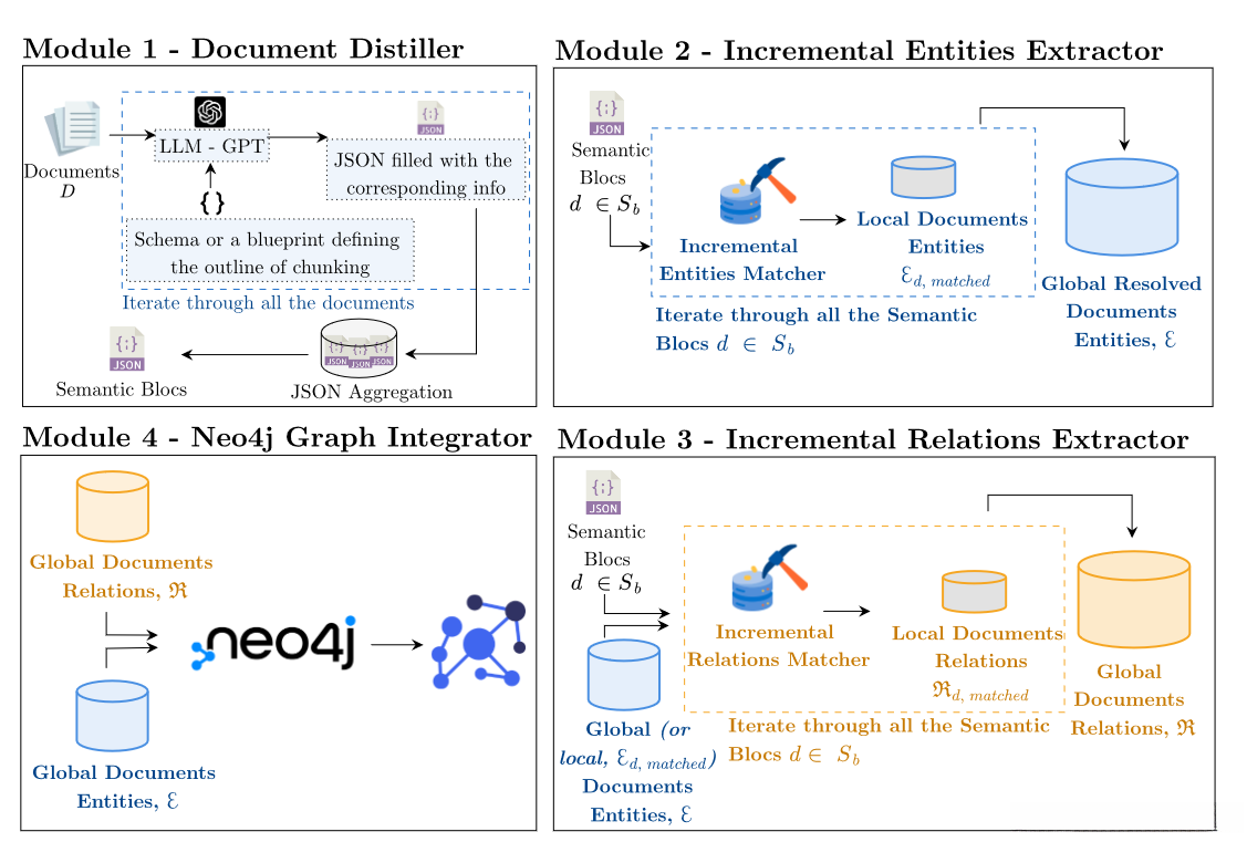 大多数的知识都是非结构化的,直接访问有价值信息会变得困难,因此自动构建知识图谱对于构建数据并直接访问至关重要。传统的NLP方法例如实体命名识别和关系提取是信息检索的关键,但需要预定义实体类型和监督学习;当前大模型可以使用零样本学习和小样本学习,然而未解决实体和关系的语义重复问题。本文提出方法,包括四个模块:文档蒸馏器、增量实体提取器、增量关系提取器、图集成器和可视化可以实现广泛的知识图谱构建场景。