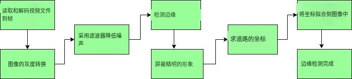def frame_processor(image): """ 处理输入帧以检测车道线。 参数: image: 道路图像,其中要检测车道线 (我们将向该函数传递视频帧) """ # 将RGB图像转换为灰度图像 灰度图 = cv2.cvtColor(image, cv2.COLOR_BGR2GRAY) # 应用高斯模糊以去除图像中的噪声 # 并聚焦在我们感兴趣的区域 # 高斯内核的大小 内核大小 = 5 # 应用高斯模糊以去除帧中的噪声 模糊图像 = cv2.GaussianBlur(灰度图, (内核大小, 内核大小), 0) # Hysteresis过程的第一个阈值 低阈值 = 50 # Hysteresis过程的第二个阈值 高阈值 = 150 # 应用Canny边缘检测并将边缘保存在变量中 边缘图 = cv2.Canny(模糊图像, 低阈值, 高阈值) # 由于我们从图像中获取了太多的边缘,因此我们应用 # 一个掩码多边形,只关注道路 # 将在后续步骤中详细解释区域选择 区域 = 区域选择(边缘图) # 应用霍夫变换以从图像中获取直线 # 并找到车道线 # 将在后续步骤中详细解释霍夫变换 霍夫 = 霍夫变换(区域) # 最后,在生成的帧上绘制线条并将其作为输出返回 结果 = 绘制车道线(image, 车道线(image, 霍夫)) return 结果AI写代码