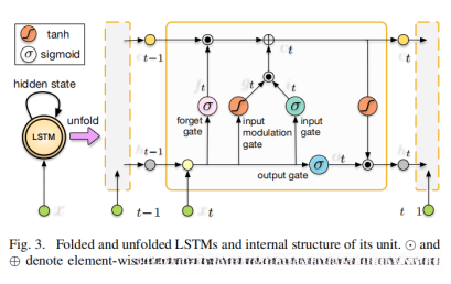 RNN不适合直接从高维原始数据(例如图像)学习顺序表示。因此,所提出的系统采用吸引人的RCNN架构,其中CNN特征作为RNN的输入。为了能够发现和利用在长轨迹上拍摄的图像之间的相关性,作者引入了LSTM网络。折叠的LSTM及其随时间变化的展开形式以及LSTM单元的内部结构如图4所示。在作者的情况下,Deep RNN是通过堆叠两个LSTM层(其中一个LSTM的隐藏状态是另一层的输入)来构造的。结合图3公式可以很直观的理解,其中 , , , 和 分别对应k时刻图中的输入们, 遗忘门,输入调制门, 记忆单元 和输出门。