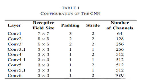 为了能提取VO问题的有效特征,作者使两个连续的单目RGB图像进行级联,然后执行特征提取。这个 VO 系统会随时间的推移而发展,并接受新图像时估计新的姿态。表1概述了CNN的配置,其中它具有9个卷积层,每个层之后的激励层使用的激活函数为Relu函数,即共有17层。