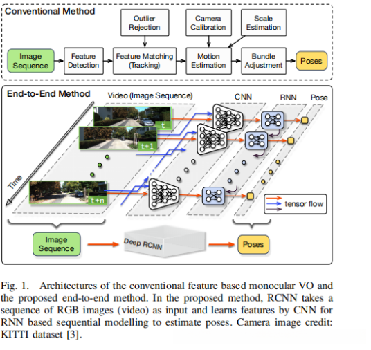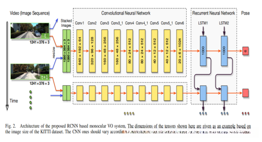 作者提出的RCNN考虑了一下这两个要求。①之前简单地采用当前流行的DNN架构来解决VO问题不现实,而学习几何特征表示的框架对于解决VO和其他几何问题很关键。②同时,由于VO系统随时间演变,并对运动期间获得的图像序列进行操作,还必须导出连续图像帧之间的连接。