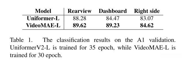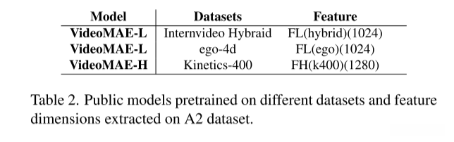 我们对多个视频表示模型以及A1视频的三个视角展开了多项实验研究。基于表1中的结果显示VideoMAE [18] 显示出了更优的表现,在本文中我们选择该方法对其后视与仪表盘视角进行特征提取分析。本研究采用了从多个数据集预训练得到的公共权重参数,并在此基础上对A1数据集进行了精细微调优化。具体所采用的权重参数信息详见表2