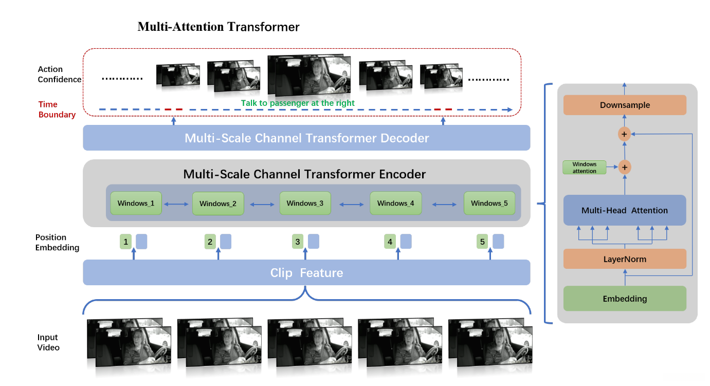 本文旨在确定未剪辑视频中每个动作的起始与结束时间。为此目的,我们提出了一种多注意力Transformer架构来解决这一问题。传统的做法是利用固定长度的时间窗来提取特征这导致仅能捕捉固定时间段内的动作信息。然而,在实际场景中视频中的上下文信息往往具有时序特性因此单一的时间窗可能无法全面反映这些特性。为此我们设计并引入了多注意力机制通过融合局部与全局注意力机制能够更灵活地捕捉不同层次的时间关系从而提升模型性能的基础上基于VideoMAE模型提取特征的方法在验证集A2上的准确率为66.34%随后,在此基础上引入时间校正机制进一步优化了模型性能,在验证集A2数据集上取得了更优的结果即准确率达到67.23%最终,在AI City Challenge 2023的Track 3 A2数据集上获得了第三名位置我们的代码可在以下地址获取:https://github.com/wolfworld6/Aicity2023-Track3