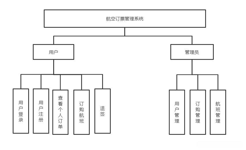 系统管理员:管理员登录;用户管理;航班管理,订购管理,修改密码;
