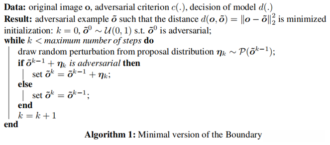 我们还提出了该类别中首个可应用于通用机器学习算法并可处理复杂自然数据集的有效攻击:边界攻击(Boundary Attack)。其核心采用了基于拒绝采样算法结合简单的提议分布及受信任区域方法 的动态步长调节机制以引导对抗样本遵循决策边界。该方案的基本操作逻辑是从较大的初始扰动值开始逐步减小其幅值直至反转以往所有对抗攻击所遵循的行为模式。值得注意的是尽管其展现出惊人的简单性但在满足一定抗干扰标准的前提下其实现效果与基于梯度的传统计算机视觉任务相当接近