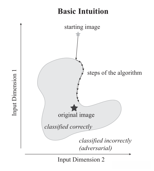 如何选择初始点——具体来说,在论文中对此问题的描述还不够清晰。在边界攻击中,则需要利用一个已经处于对抗状态下的样本作为初始化的基础。