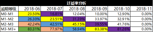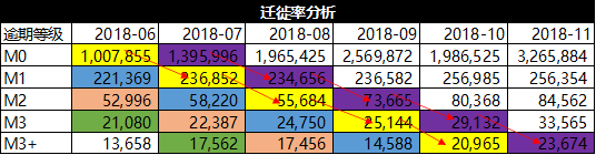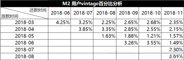 上表是对M2用户的Vintage分析(M2表示历史逾期大于60天),行为放款时间,列为到期还款期的表现(M2的表现时间需要3个月,故3月份放款从6月看 ),比如4.25%就是2018年3月授信放款的用户在2018年6月份M2逾期的情况(2018年3月授信的用户在6月的M2逾期的总额/2018年3月份用户总的放款金额);从表中可以看出2018-03月的授信的用户M2逾期率明显偏高,这就需要去分析逾期较高的原因,授信策略是否有漏洞还是模型cut—off较低。