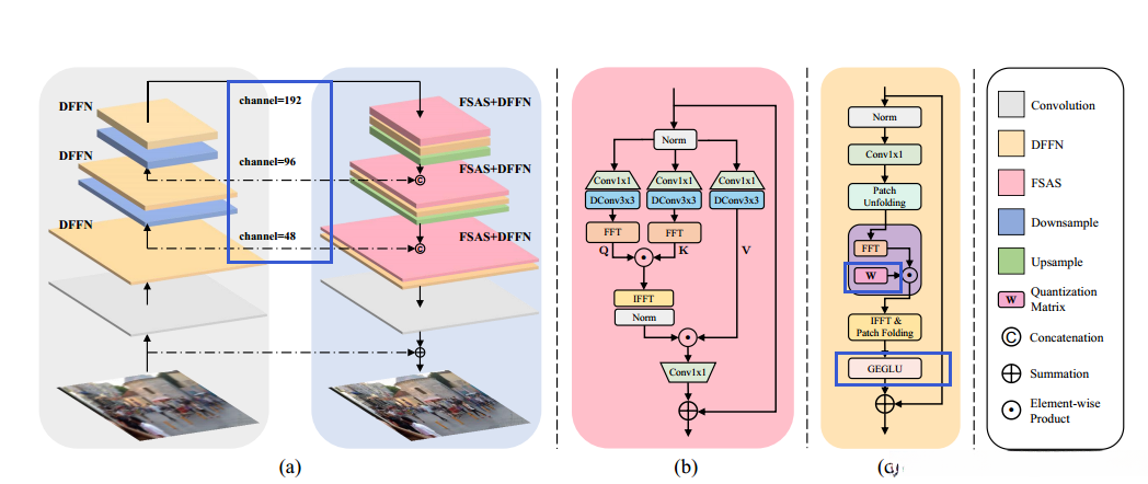 这启发我们开发一种有效的基于频域的自注意求解器(FSAS) ,通过元素积运算来估计缩放后的点积注意,而不是在空间域中的矩阵乘法。此外,我们注意到,在transformer中简单地使用朴素前馈网络(FFN)并不能产生良好的去模糊结果。为了克服这个问题,我们提出了一种简单而有效的基于鉴别频域的FFN (DFFN),其中我们在FFN中引入了一种基于联合摄影专家组(JPEG)压缩算法的门控机制,以判别应该保留哪些低频和高频特征信息以进行潜在的清晰图像恢复。我们将提出的FSAS和DFFN形成一个基于编码器和解码器架构的不对称网络 ,其中FSAS仅用于解码器模块以更好地去除图像模糊。实验结果表明,该方法优于现有的方法。