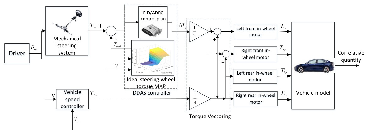 - 状态反馈控制系统:通过调整转向电机输出转矩,在车辆侧向加速度与偏航角速度基础上实施反馈控制机制,有效地降低了车辆发生侧滑与失控的可能性。