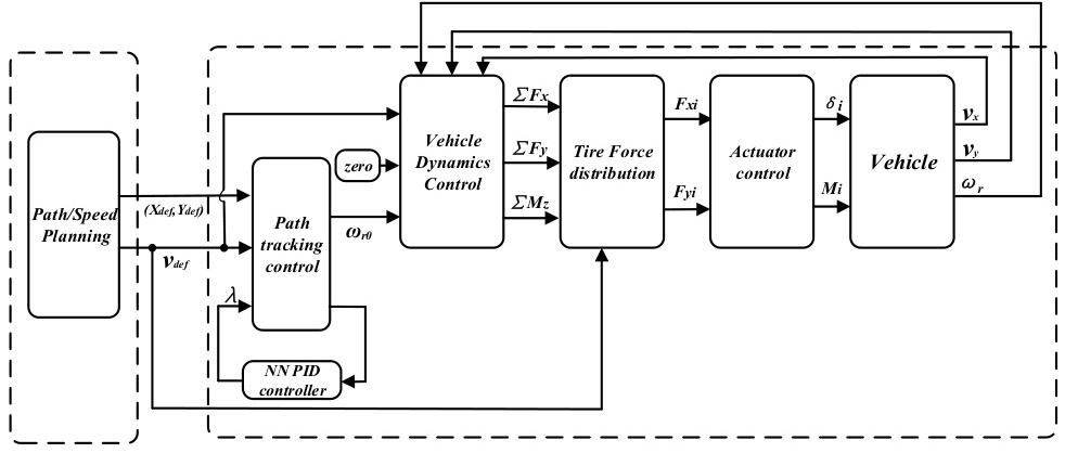 动态路径跟踪 * 融合基于车辆动力学的运动模型与反馈控制系统, 通过路径/速度规划模块预测运动轨迹, 协调驱动轮的驱动力与转向系统, 以确保车辆能够准确遵循设定路径。其中, 神经网络PID控制器与LQR控制器被有效应用于轮胎力分配及执行器动作调节过程中。