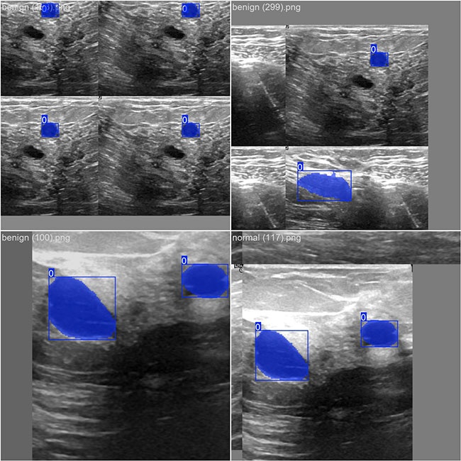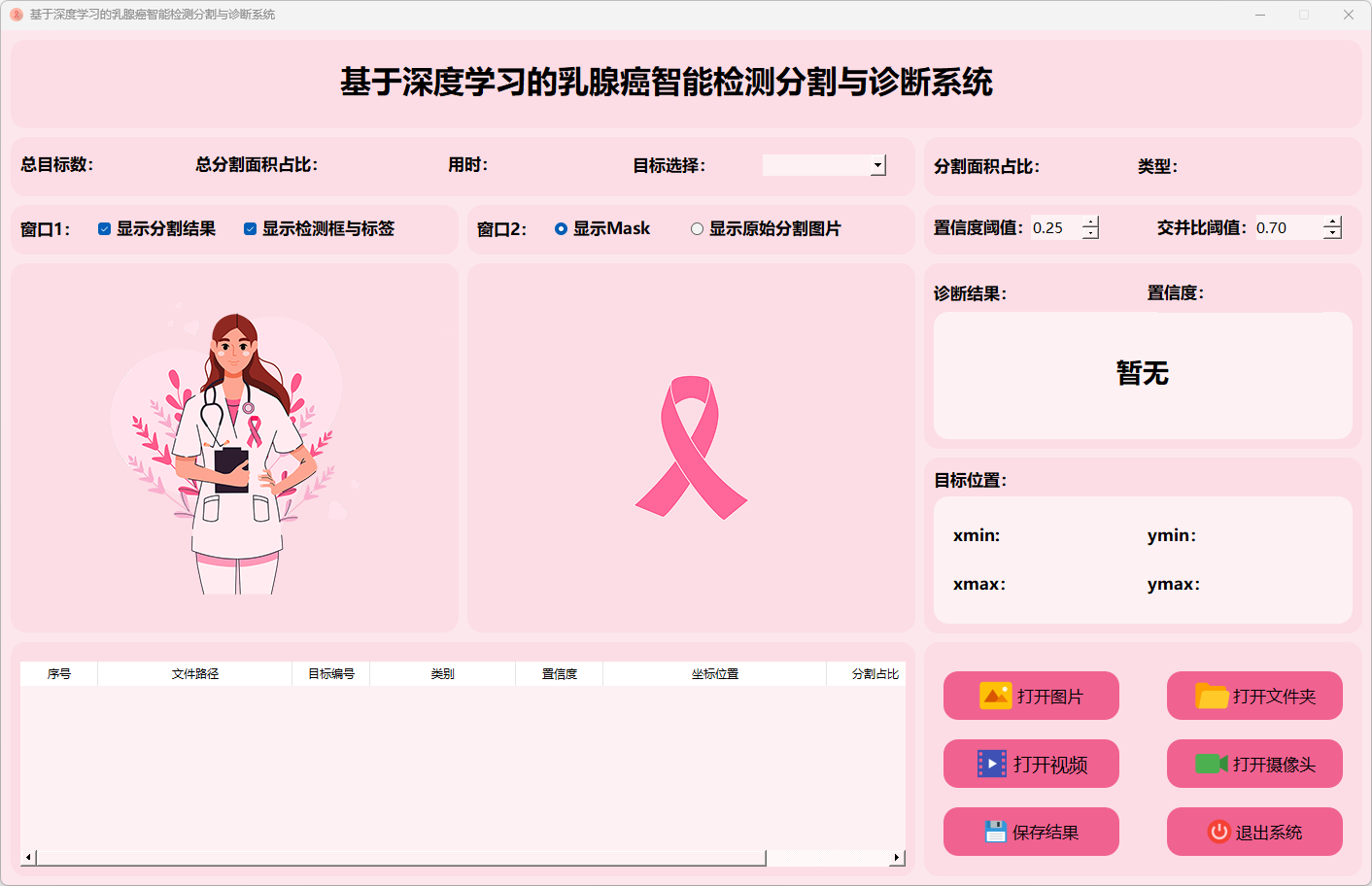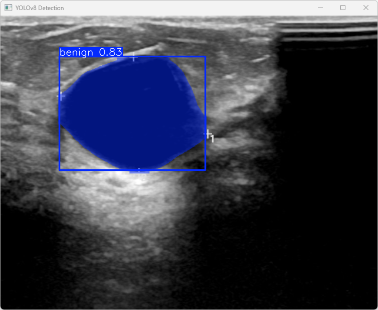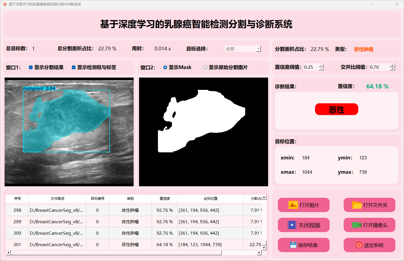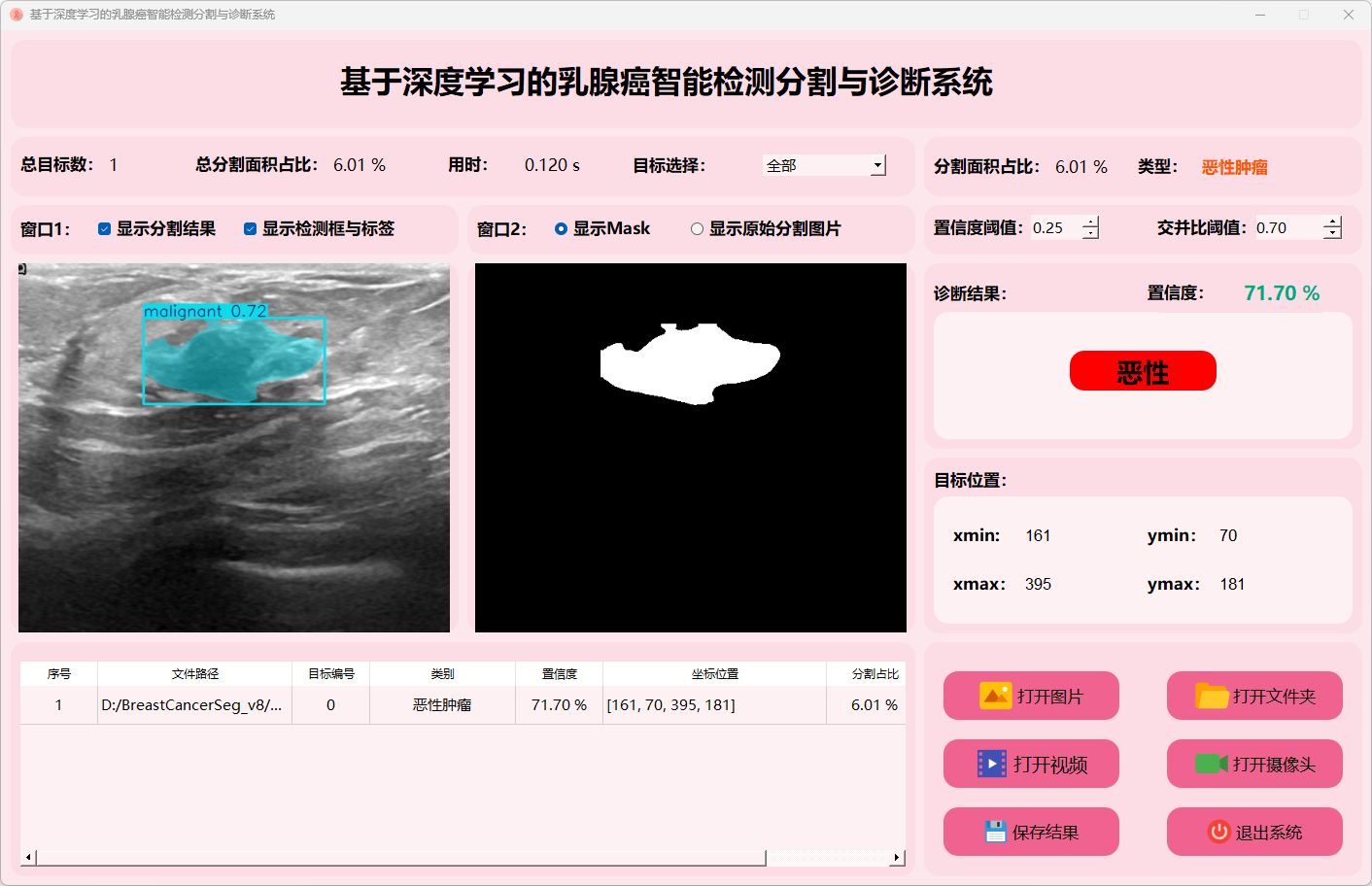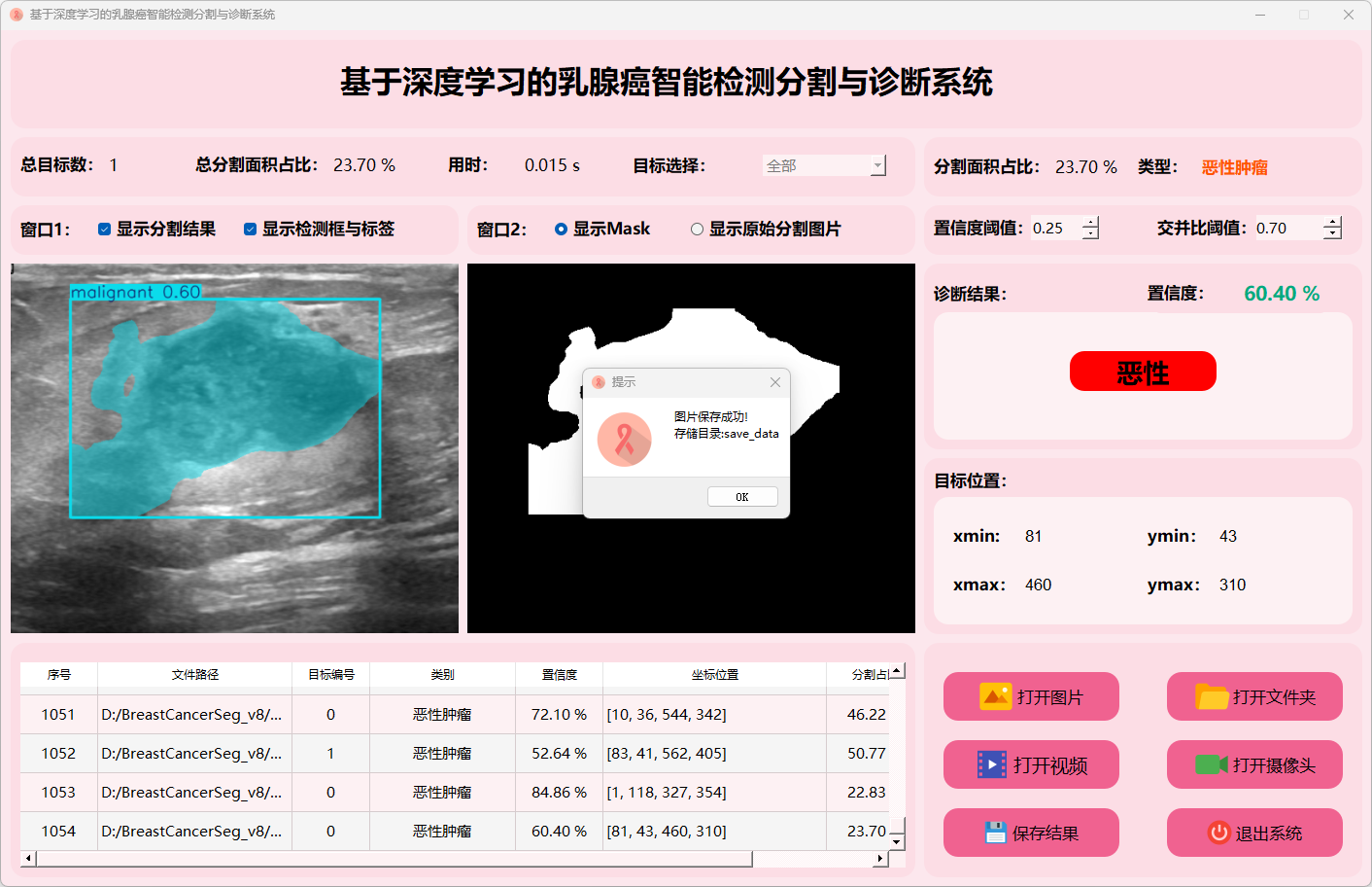 该界面直观地呈现了系统在视频帧上的多目标检测性能。该系统能够准确识别乳腺癌分割图像,并详细地提供了相应的检测结果及其置信度评分。
