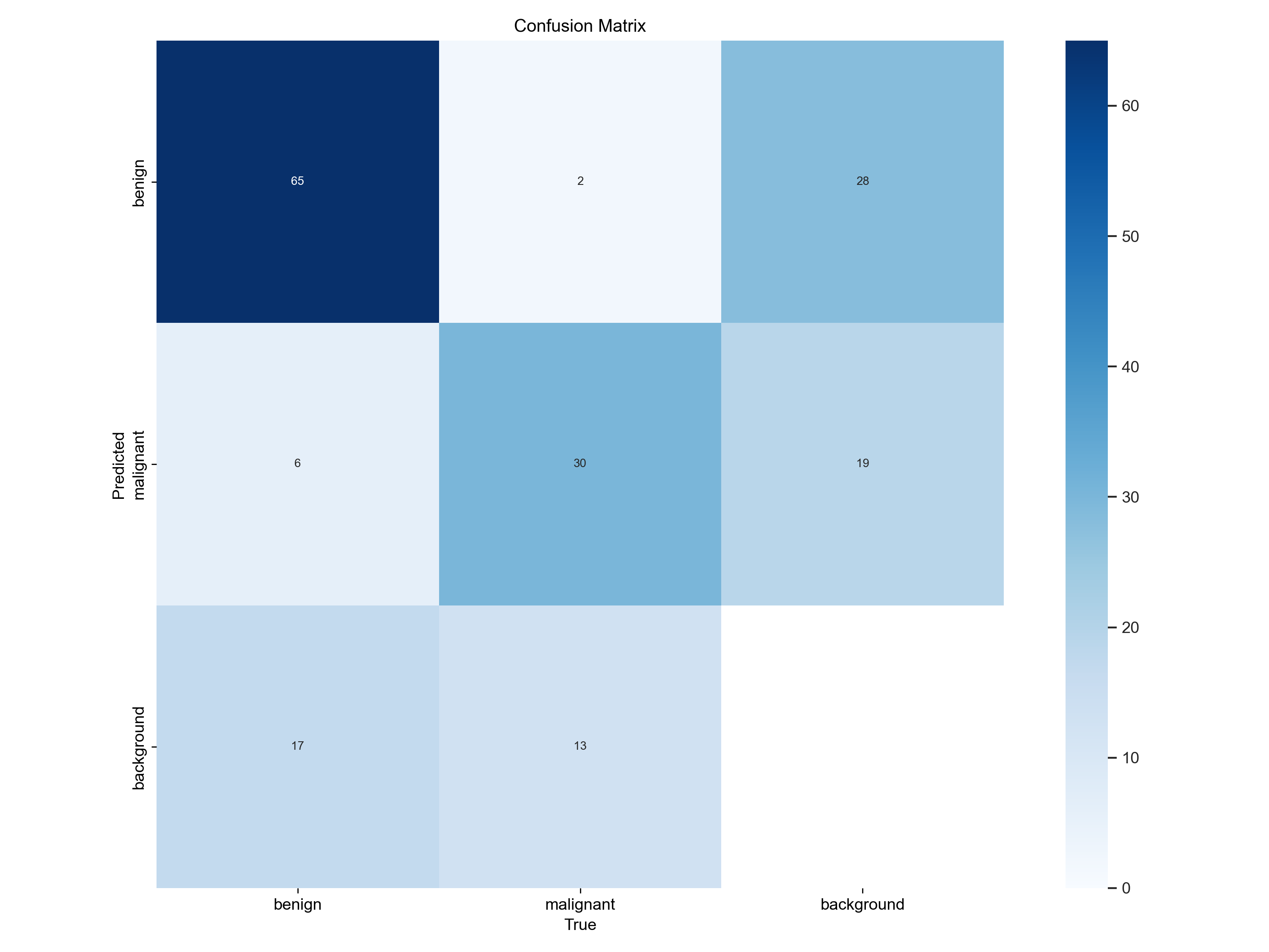 该模型在经过150轮训练后,在验证集上的mAP@50指标达到了 0.759 ,其中良性样本的检测表现达到了 0.797 ,但在恶性样本上的检测水平还需进一步优化(达 0.597 ),整体性能表现良好。