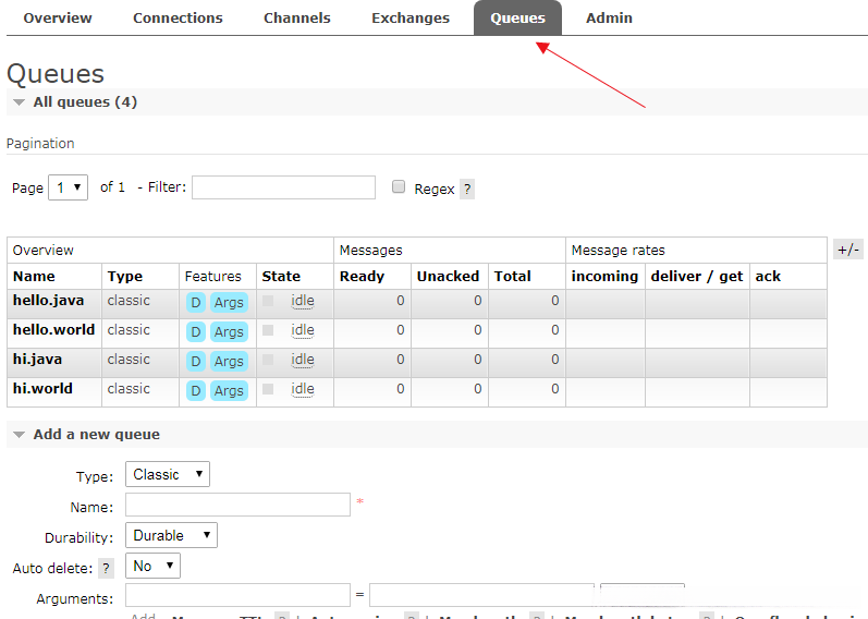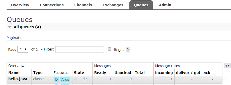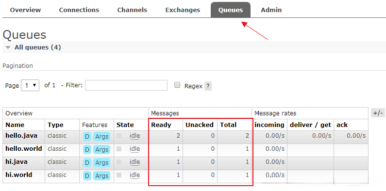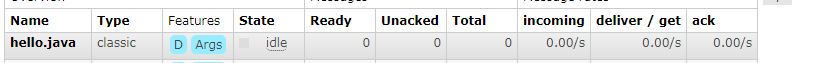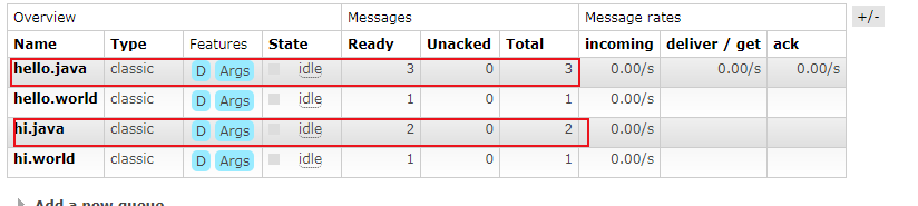 浏览队列信息时,我们可以看到hello.java和hi.java队列的消息数量上升了1个,并表明有新消息到达。