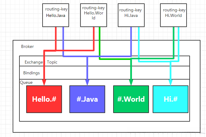 例如:假设消息的路由键为 Hello\#Java 的形式,则该路由键与 Hello\#- 模式匹配,并因此会分配到对应的Hello\#Java队列中;同时也会与 #Java 模式匹配并分配到相应的Hi\#Java队列中。
