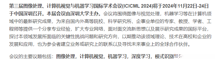 【学术会议征稿】第三届图像处理、计算机视觉与机器学习国际学术会议(ICICML 2024)