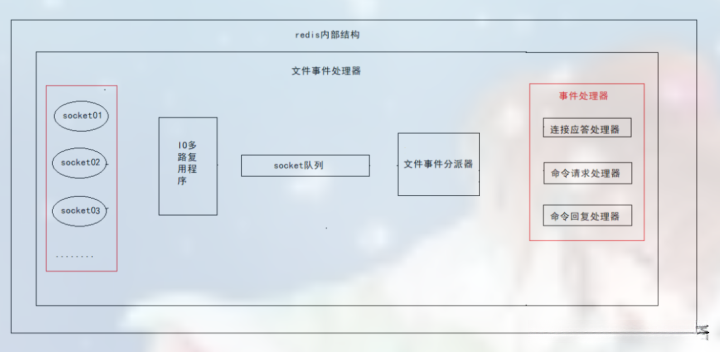 该系统由四个部分构成:多种套接字、IO多路复用程序、文件事件分配器、事件处理器。