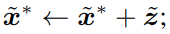 z是每次迭代中的随机噪声,服从N分布,对z双线性插值得到z'以后,对z'添加一个偏置,如果L(x'+z')<L(x'),说明我们找到了一个更好的方案,所以令