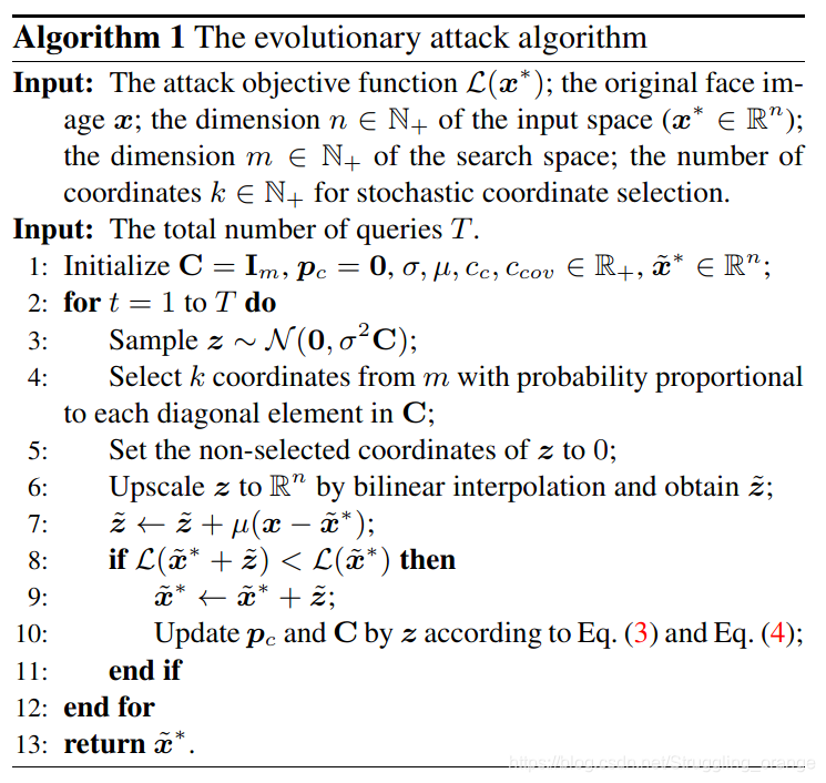 2.进化攻击 。通过对CMA-ES(协方差矩阵适应进化策略)进行变体,得到(1+1)-CMA-ES,通过在每一次迭代中挑选更好的一个后代进入下一个迭代,通过这个方法解决黑盒优化问题。但是,直接使用此策略对攻击设置中提出的约束条件进行优化是无效的,因为x'维度较高。且基于决策的人脸图像黑盒攻击存在查询限制,原(1+1)-CMA-ES可能不可行。为了加快算法速度,设计了一个适当的分布来采样每个迭代中的随机噪声,这样可以对搜索方向的几何形状建模,也提出了一些方法降低搜索空间的维度。算法如下: