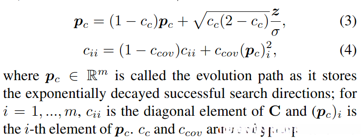 协方差矩阵自适应问题 ,协方差矩阵的计算复杂度为O(m^2),在黑盒攻击中,m较大,所以计算量更大,为了降低计算量,将协方差矩阵松弛为对角矩阵,然后在每次成功试验后,按照下面的法则进行更新: