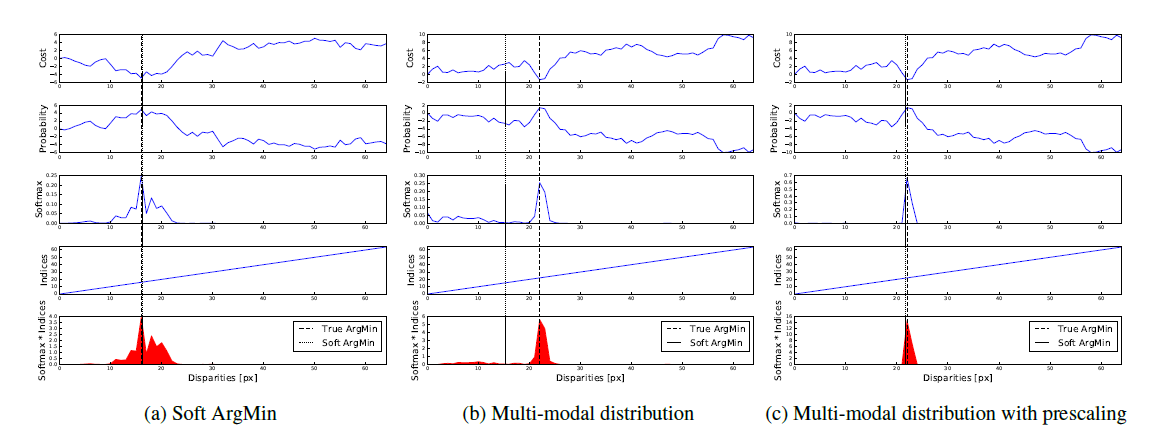 argmin操作的图标描述。以每个偏差线为横轴,纵轴是argmin的输出估计,还有偏差softmmax估计还有偏差指数的点乘。a表示当曲线是单模式时,可以精确的捕捉到真实的argmin。b表示当数据是双模式时,即有峰有平区域时,是一个失败的例子。c表示如果网络学习对cost曲线进行预处理,那么失败将会消失,因为softmax可能性将会更加的极端化,产生出一个单模式的结果。(单模式和双模式不是很理解)