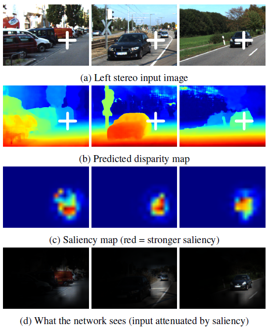 本文模型能够使用更加宽泛的纹理信息来更好的表示图像局部几何信息。下图,saliency map表示的是针对每个输入像素的输出敏感度。51中的方法暗示了预测视差图是occlude the input images的一种函数。通过点的视差来抵消每个图片中的occlusion。
