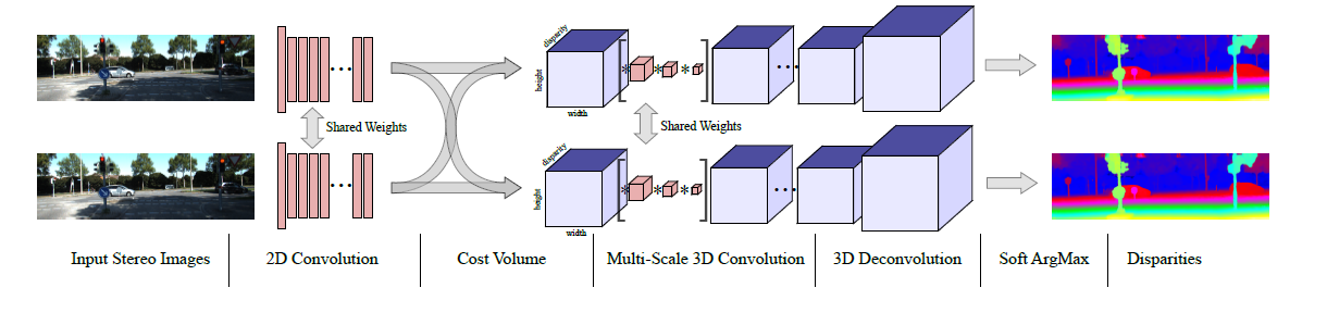 使用深度特征表示组成成本向量,充分利用3D卷积提取上下文的纹理信息。深度值以差分softargmin操作相规范化,没有额外的预处理或者正则化得到一种端到端的方法
