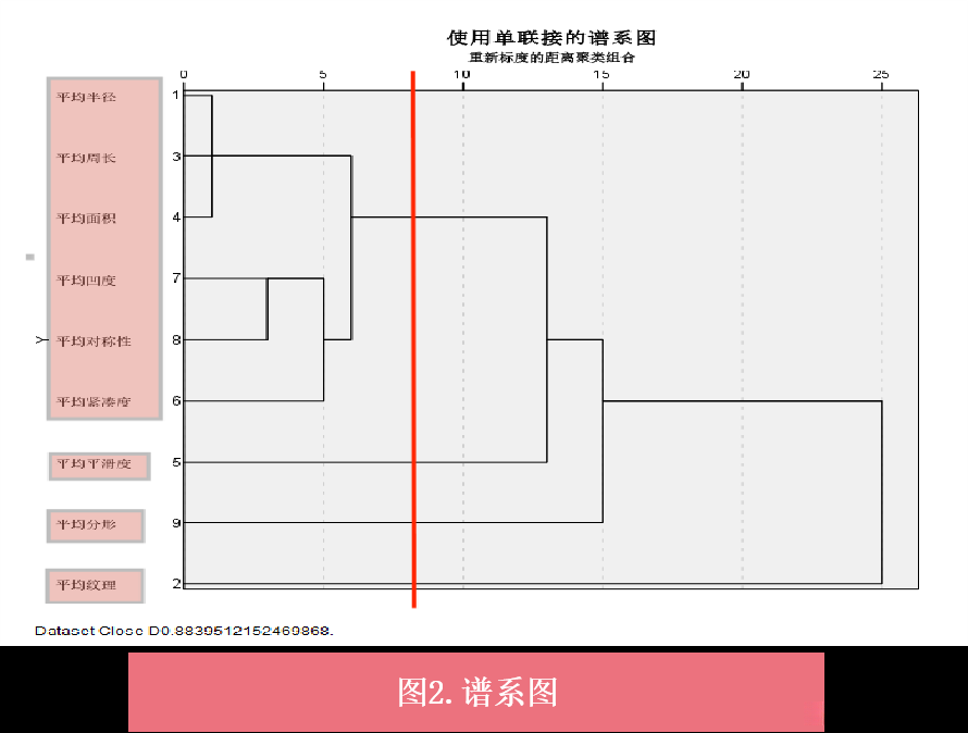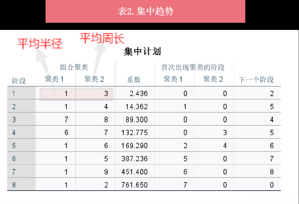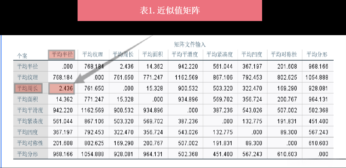 在本实验中,SPSS被用于执行一系列数据处理步骤。具体而言,在计算样本间的相似性程度时,默认采用了欧氏平方距离这一指标。由此可知,在此过程中两个样本之间数值越接近,则表示它们之间的差异程度越大。然而,在计算类别间的相似性时,默认采用了最短距离法这一策略,在SPSS软件中对应的操作为最近邻元素分类法。根据表1的数据结果可以看出:平均周长指标与平均半径指标之间的最短距离最小,并且这种现象最先出现在第一类内部