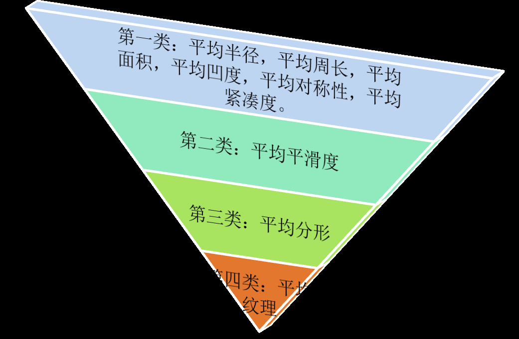 第一类包括以下各项:平均半径、周长、面积、凹度、对称性和紧凑度等参数。这些指标全面描述了乳房表面特征并能有效识别乳腺癌前期症状;