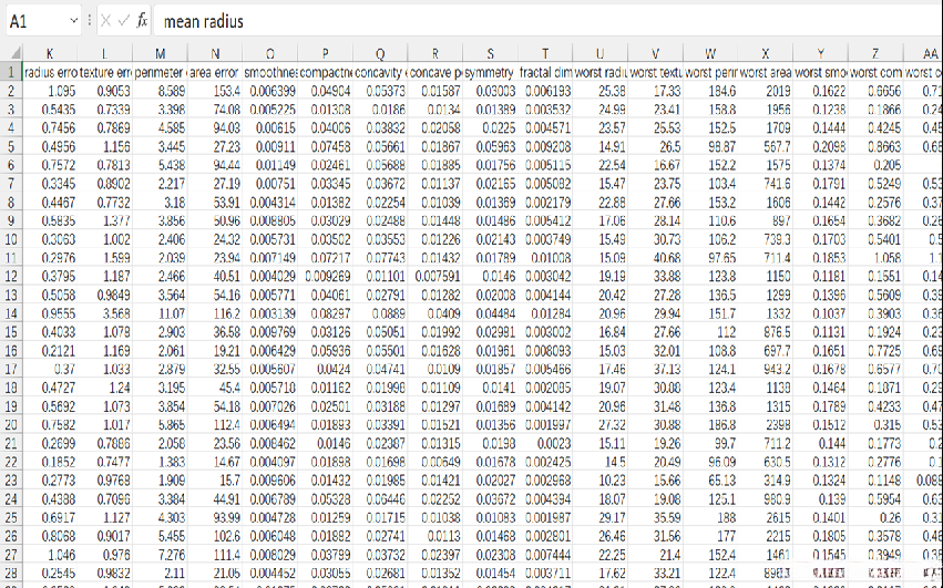 本实验数据基于机器学习领域的美国威斯康星州乳腺癌数据集,包括569名患有乳腺癌的患者群体