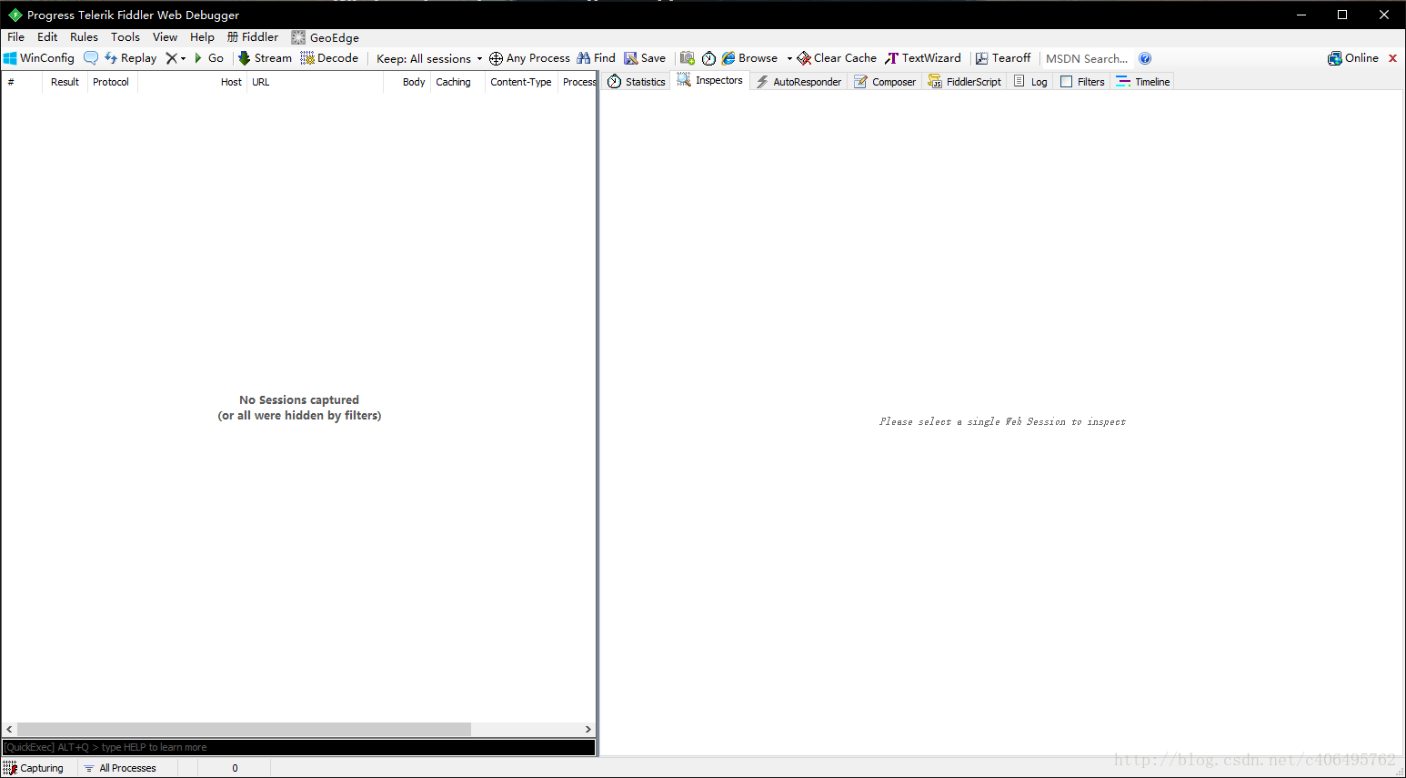 傻瓜式安装,一键到底。Fiddler软件界面如图所示: