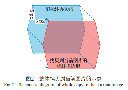 针对第一个功能点“对整个标注多边形进行拷贝”,本系统提供两种拷贝方式,即“整体拷贝到当前图片”和“整体拷贝到下一张图片”,两种拷贝方式通过右键菜单以菜单选项显示,供标注人员选择。拷贝到当前图片的标注多边形与原标注图形原本在同一位置,会重叠在一起,无法区分选择,所以设计复制的标注图形向右下偏移 5 像素,方便标注人员区分与选择,如图 2 所示。拷贝到下一张图片的标注多边形在位置和大小上与原标注多边形保持一致。