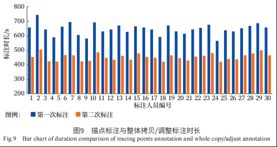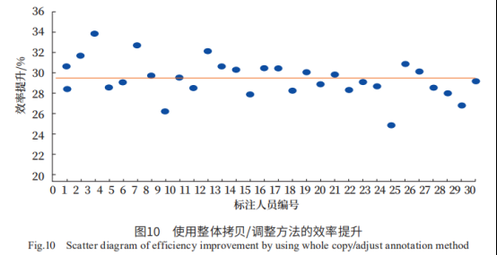 从图 9 中可以看出,在其他标注条件相同的情况下,每个标注人员使用整体拷贝 / 调整标注方式辅助标注的标注时间都少于仅使用描点标注方式的标注时间。由图 10 可得,90% 人员的标注效率提升超过 28%,标注效率平均提升 29.7%,说明该方法可以有效提升标注效率。