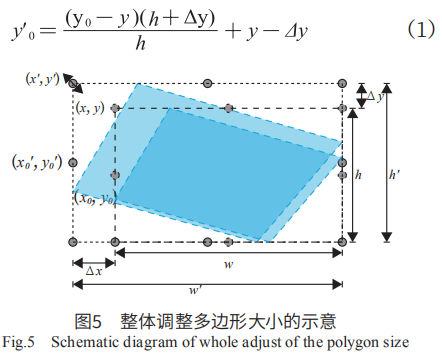 拖拽边界框左上调整点来整体调整多边形大小的示意如图 5 所示。假设向左调整宽度为 Δx,向上调整宽度为 Δy,那么调整后的边界框 P (x , y , w ,h )=(x-Δx, y-Δy, w+Δx, h+Δy),以多边形顶点 (x0, y0) 为例,调整后该顶点为 (x0 ,y0 ),显而易见 x0 = x0-Δx,y0 的计算如公式(1)所示。
