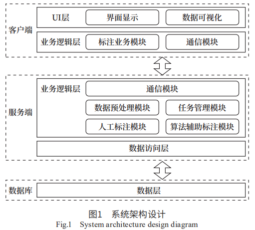 本标注系统采用 B/S 架构 [6],前端使用 React[7]框架,后端使用 Flask 框架 [8],前后端通信使用Axios 库和 SocketIO[9] 技术,采用前后端分离模式,采用关系型数据库 MySQL[10] 存储数据。前端即客户端主要包含 UI 层和业务逻辑层,UI 层负责界面展示和数据可视化,同时提供数据标注工作相关的交互功能,业务逻辑层负责实现前端标注操作的业务逻辑,处理数据变化,并提供与后端的通信的功能。后端即服务器端主要包含业务逻辑层和数据访问层,业务逻辑层提供接口给客户端,为客户端功能的实现提供业务逻辑处理,并集成图像分割算法模块,数据访问层控制对数据库的访问操作,为业务逻辑层提供增删改查方法。系统架构设计如图 1 所示。